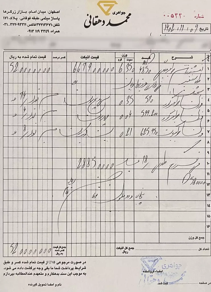 - فاکتور باید اطلاعات دقیق شامل وزن، نوع سنگ، نوع فلز، عیار و قیمت را داشته باشد.
